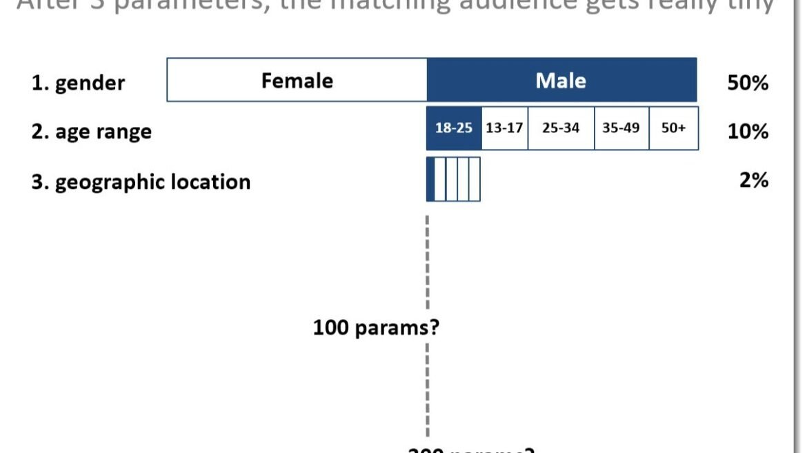 Targeting. First we start with “targeting” in digital channels. Unlike on Facebook and Gmail, most humans are NOT logged into sites that they visit for content. That means the sites/publishers don’t know who the users are. So they started using tracking cookies in browsers to identify the users who visited. With these cookies, adtech companies could harvest the list of sites that a user visited and deduce what the user liked and possible who the user was. For example, if a user visited Sports Illustrated, ESPN, Maxim, and Playboy, it would be easy to deduce the user was male. Conversely, if the user visited Victoria’s Secret, Tampax, etc, one could deduce the user was female. But this kind of inference and deduction get far less accurate when we move beyond these over-simplistic examples. What can you deduce about users that visit Amazon dot com or Walmart dot com? Right, it’s much harder.