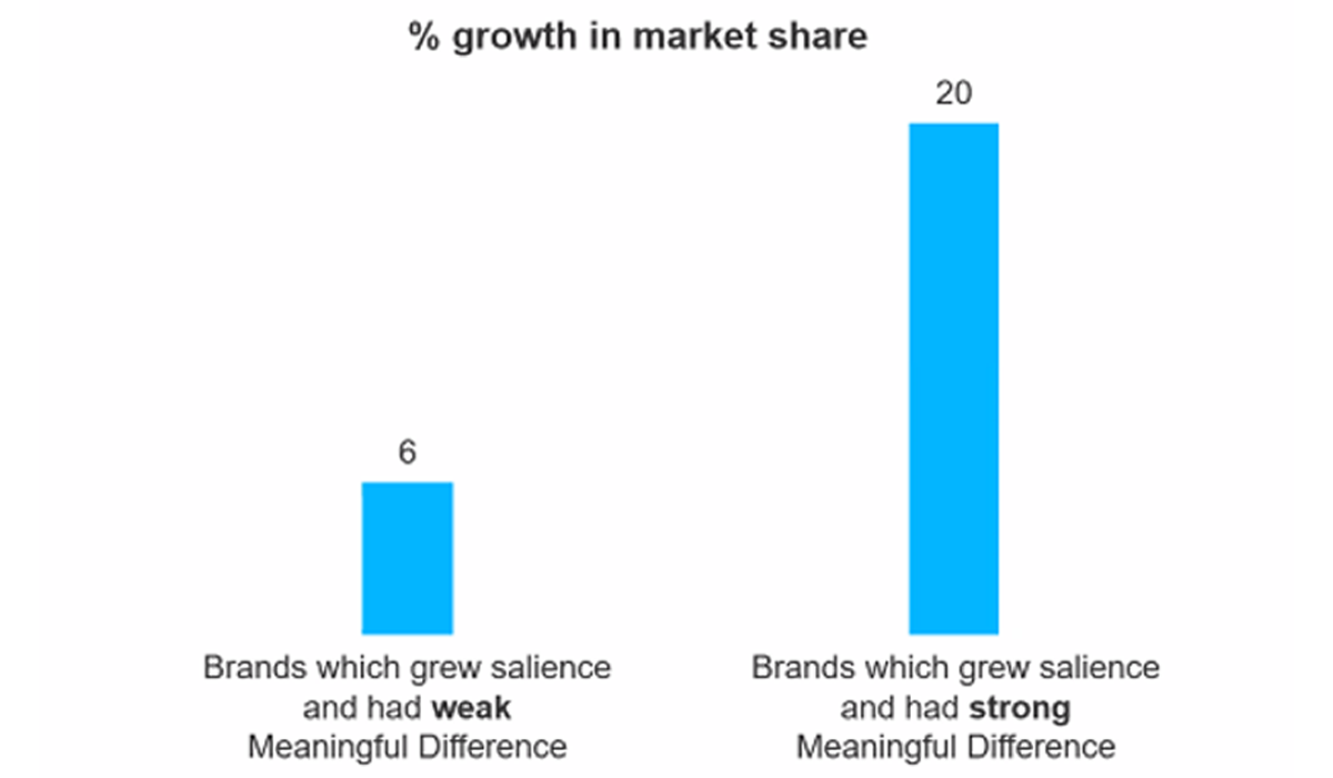 That hegemony is so strong at the moment that to even suggest that some brands might be perceived differently from others is to elicit cat calls and “rhubarb-rhubarbs” from most conference audiences. This despite the fact that it is patently true, and that Kantar have been politely proving the combination of salience and meaningful difference is greater than the sum of those two parts for years.
